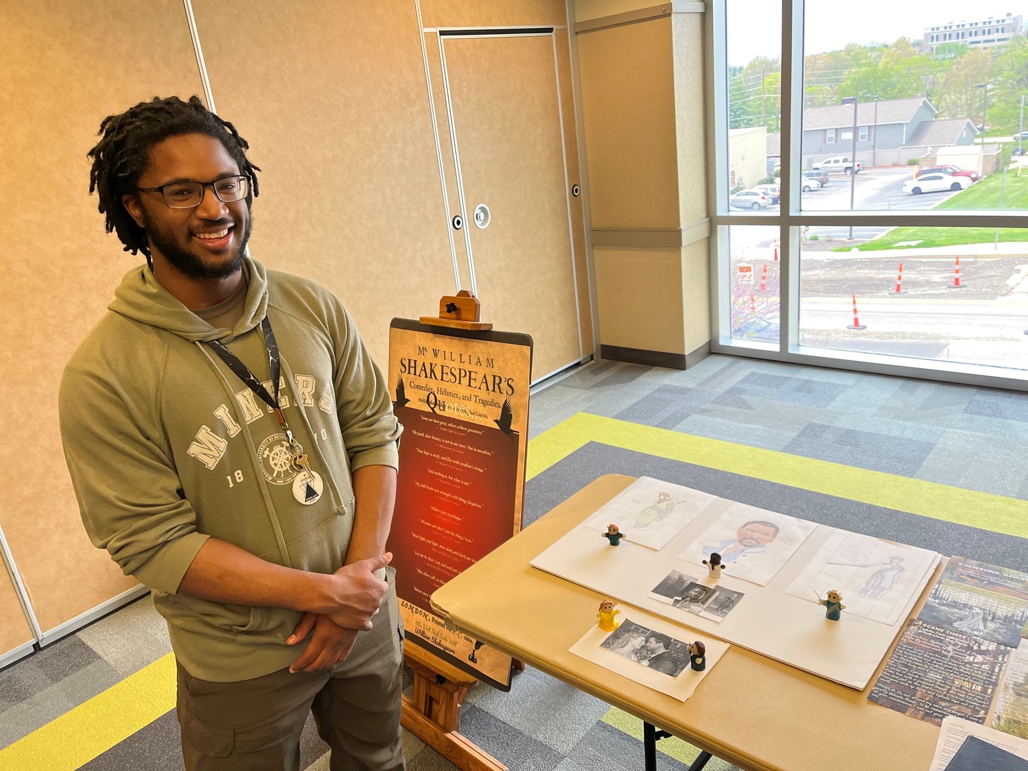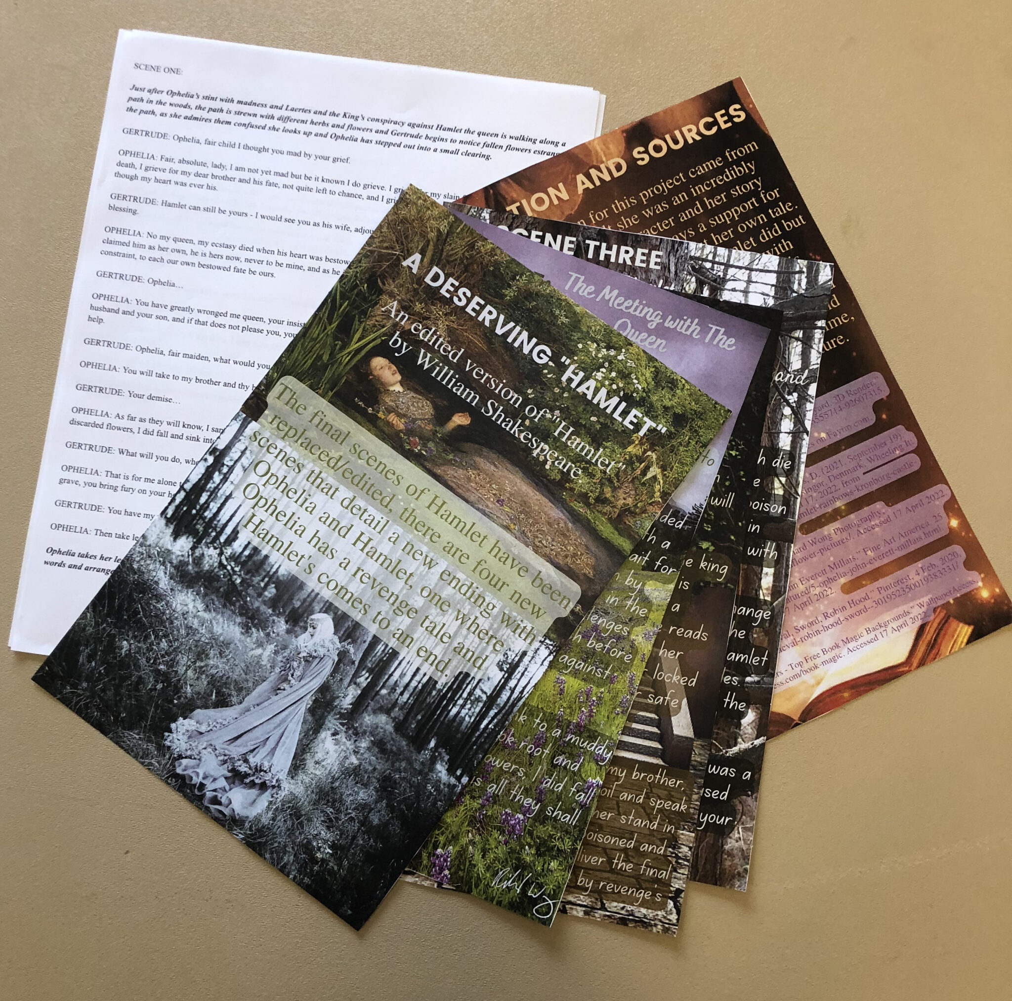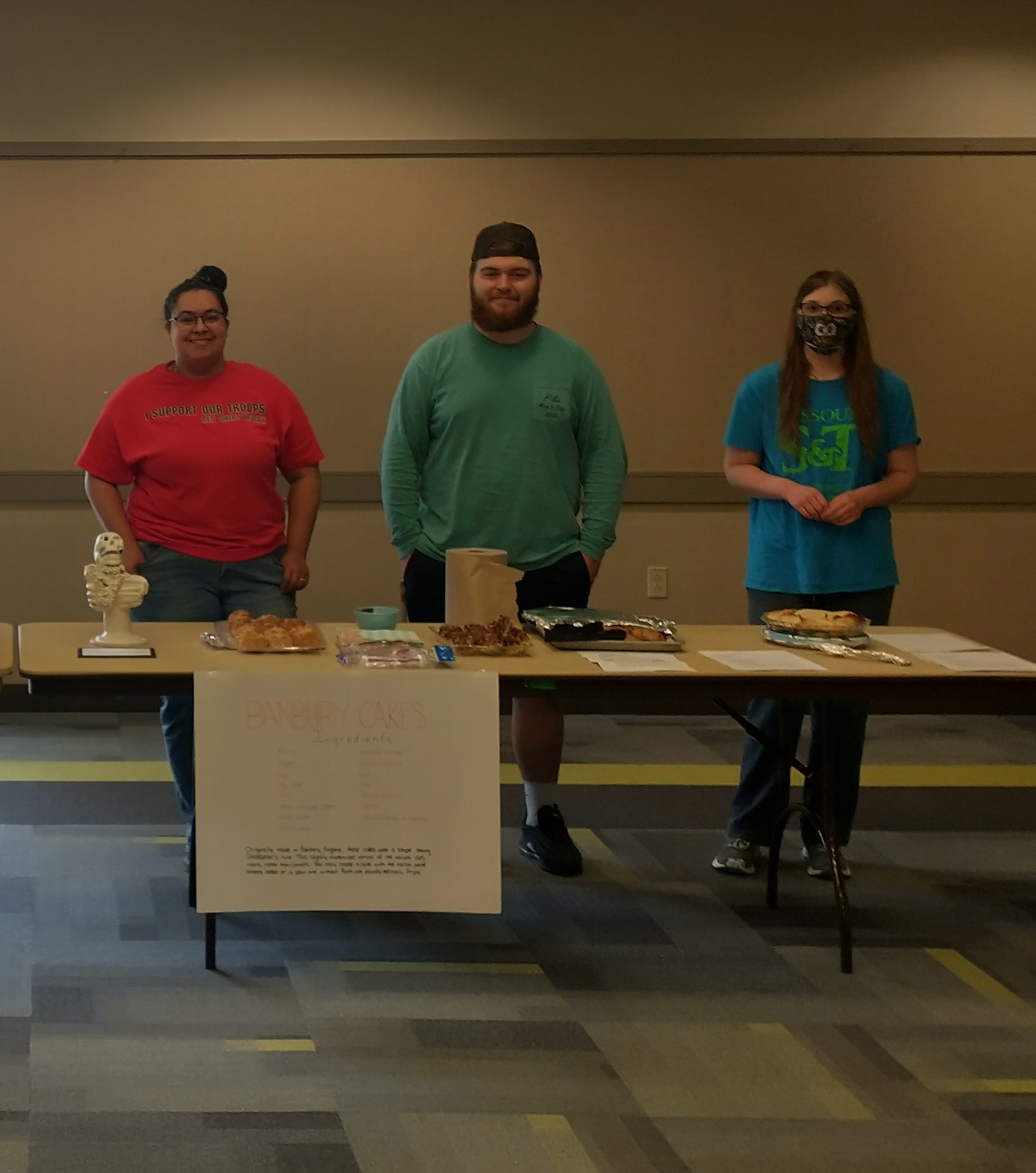 Students in English 3214 Shakespeare participated in S&T’s annual Renaissance Fair in the Havener Center on April 29, 2022. Their contributions included a bust of the drowned Ophelia, posters and a script for a new ending to Hamlet, sketches and weenicons of Shakespeare’s characters, a photograph of the assassination of Julius Caesar with one person playing all the roles, gooseberry fools (from a recipe in the book Shakespeare’s Kitchen), and venison pie (a popular Renaissance dish).